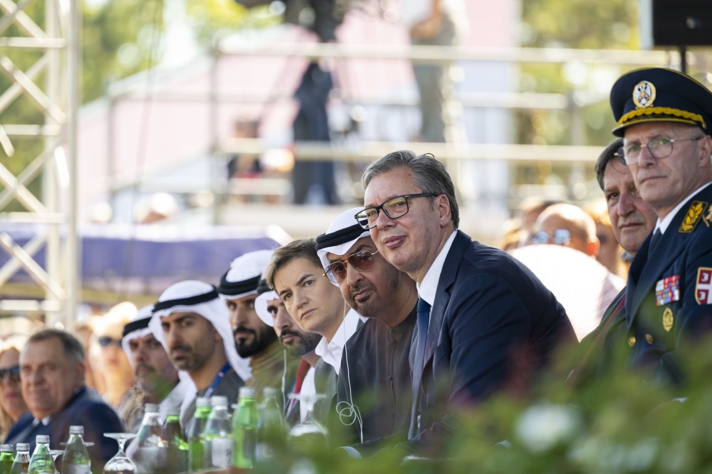 كما شهد العرض..سمو الشيخ حمدان بن محمد بن راشد آل مكتوم، ولي عهد دبي نائب رئيس مجلس الوزراء وزير الدفاع، وسمو الشيخ حمدان بن محمد بن زايد آل نهيان نائب رئيس ديوان الرئاسة للشؤون الخاصة، ومعالي الشيخ محمد بن حمد بن طحنون آل نهيان مستشار رئيس الدولة وعدد من الوزراء وكبار المسؤولين المرافقين لصاحب السمو رئيس الدولة خلال زيارة صربيا.