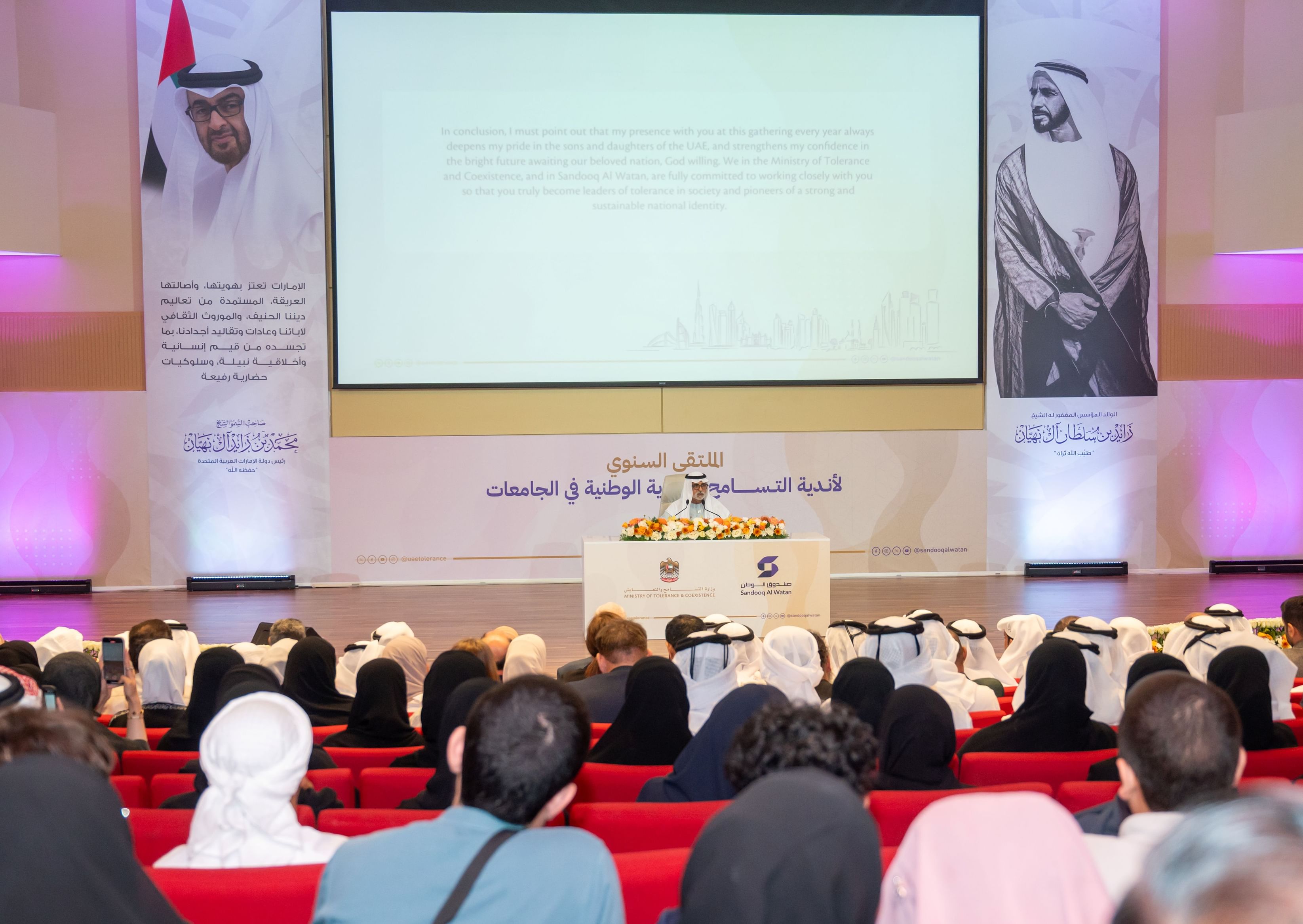 جاء ذلك خلال افتتاح معاليه، اليوم، الملتقى السنوي الرابع لطلاب أندية التسامح وأندية الهوية الوطنية بالجامعات، بجامعة العين.
