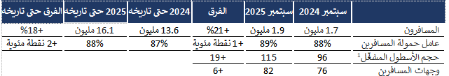 نقلت الاتحاد للطيران 1.9 مليون مسافر في سبتمبر 2025، بزيادة 21% مقارنة بالشهر نفسه من العام الماضي. ويعكس هذا النمو استمرار الطلب على امتداد شبكتها العالمية المتوسعة، والأداء التشغيلي القوي حتى نهاية موسم الصيف. وبلغ متوسط عامل حمولة الركاب 89% خلال الشهر، بزيادة قدرها نقطة مئوية واحدة عن سبتمبر من العام الماضي، مما يدل على كفاءة استخدام الطاقة الاستيعابية المضافة.