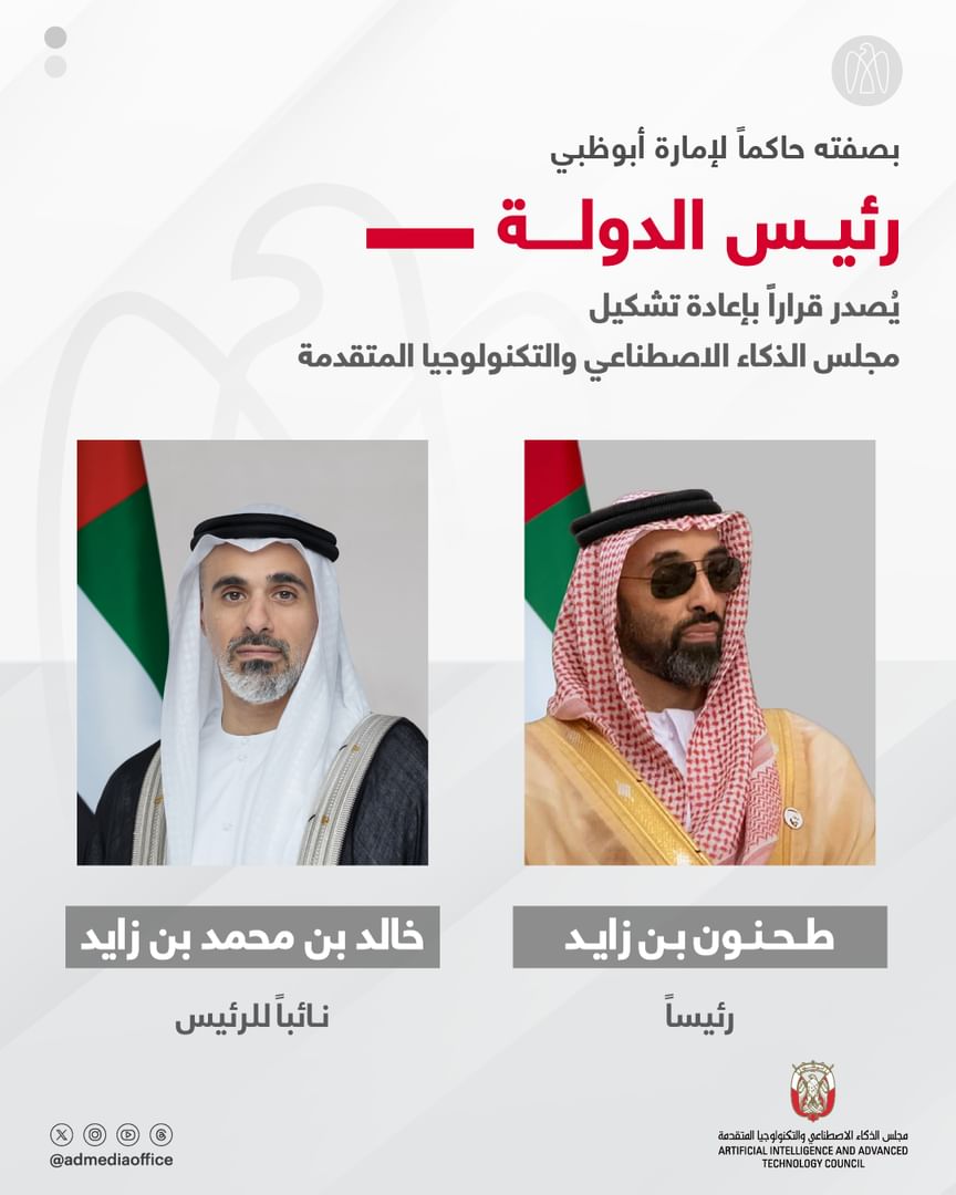 الامارات 7 - أصدر صاحب السموّ الشيخ محمد بن زايد آل نهيان رئيس الدولة، حفظه الله، بصفته حاكماً لإمارة أبوظبي، قراراً بإعادة تشكيل مجلس الذكاء الاصطناعي والتكنولوجيا المتقدمة، برئاسة سموّ الشيخ طحنون بن زايد آل نهيان، وسموّ الشيخ خالد بن محمد بن زايد آل نهيان نائباً للرئيس.
