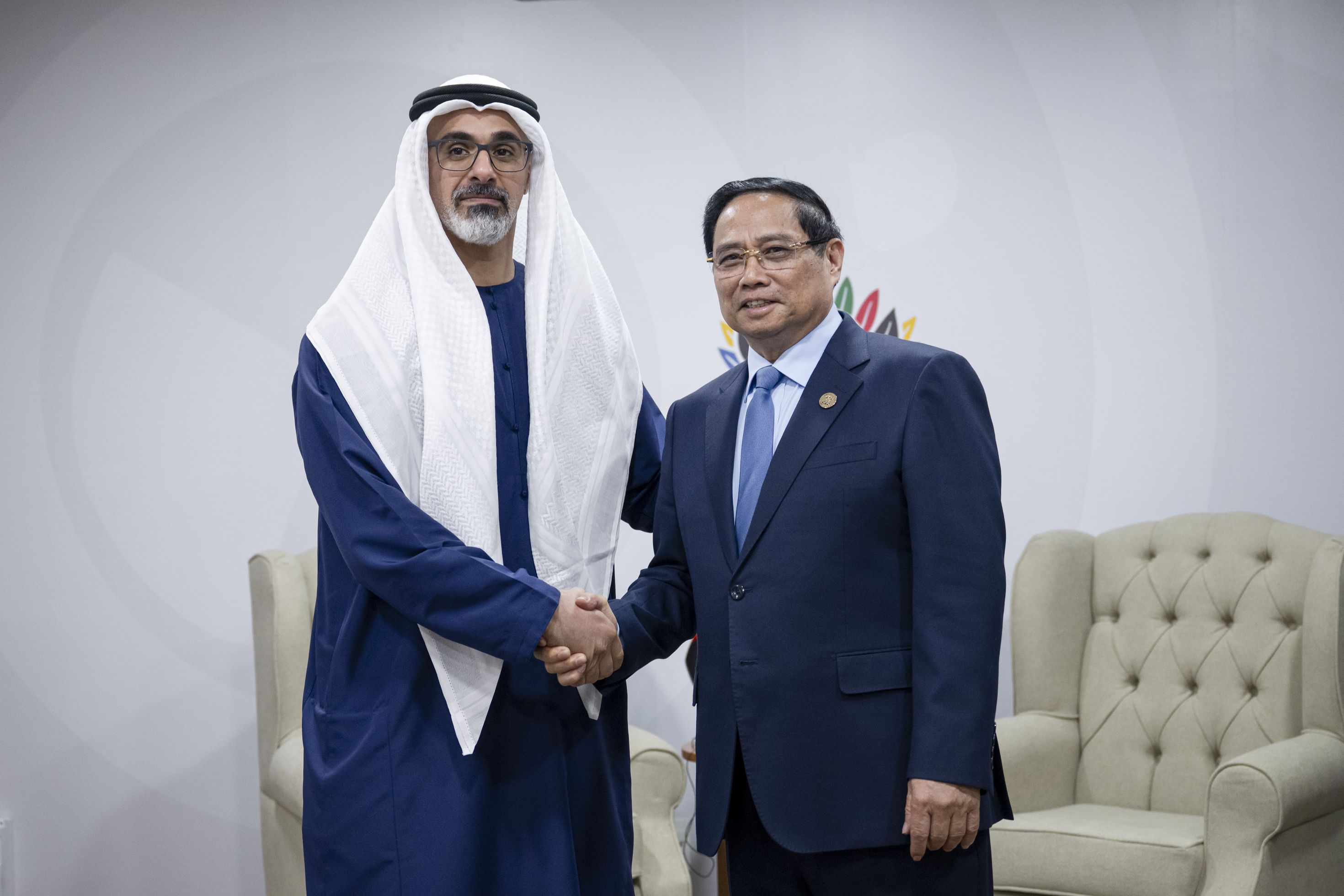 الامارات 7 - التقى سمو الشيخ خالد بن محمد بن زايد آل نهيان، ولي عهد أبوظبي، اليوم، معالي فام مينه تشينه، رئيس وزراء جمهورية فيتنام الاشتراكية، على هامش أعمال قمة مجموعة العشرين المنعقدة في مدينة جوهانسبرغ بجمهورية جنوب أفريقيا.