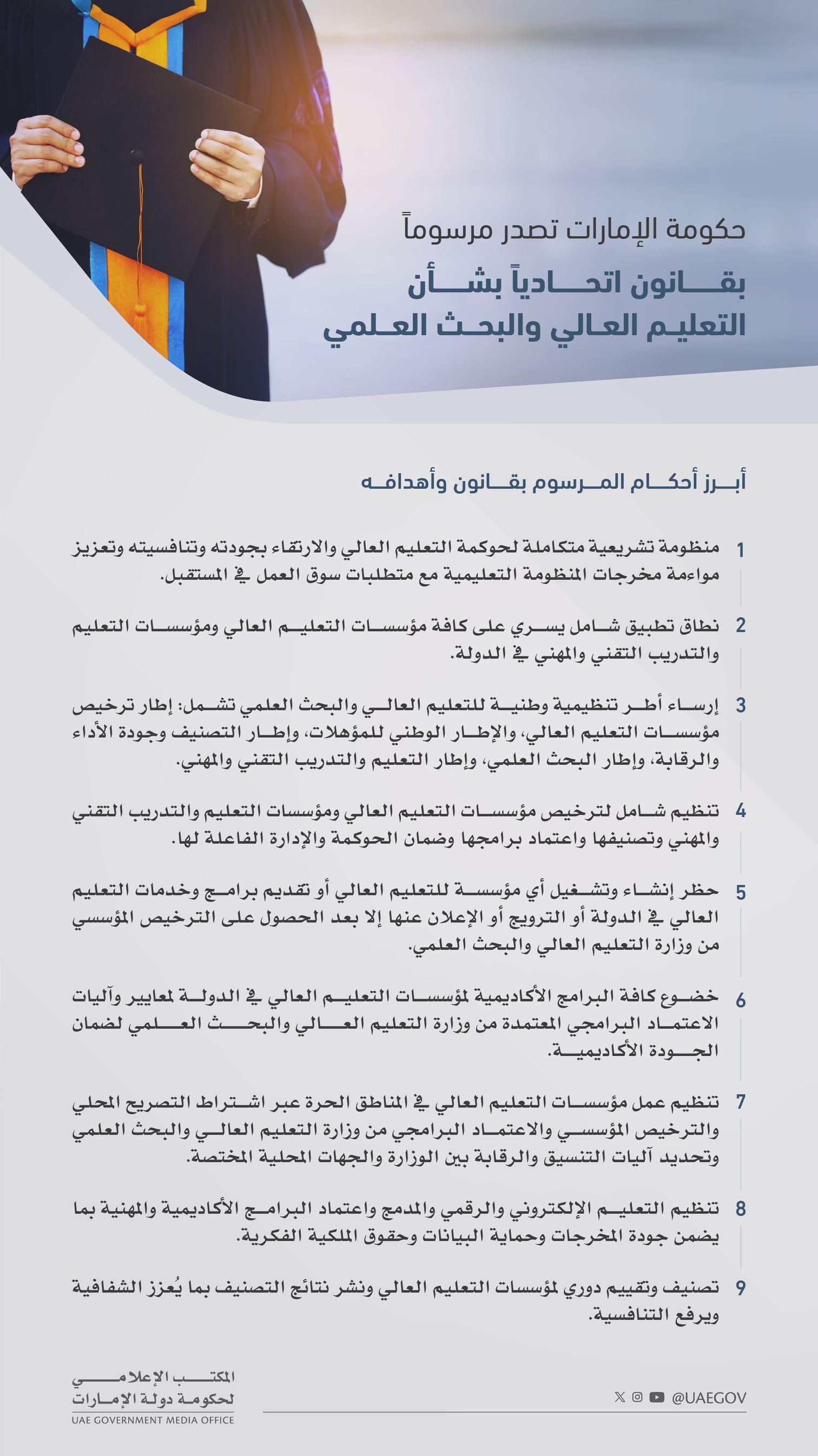 ويؤكد المرسوم بقانون التزام الدولة ببناء منظومة تعليم عالٍ مرنة ومستدامة، ترتكز على الجودة والشفافية والحوكمة، وتدعم الابتكار والتعلّم مدى الحياة، بما يرسّخ مكانة دولة الإمارات كمركز إقليمي وعالمي للتعليم العالي والبحث العلمي.