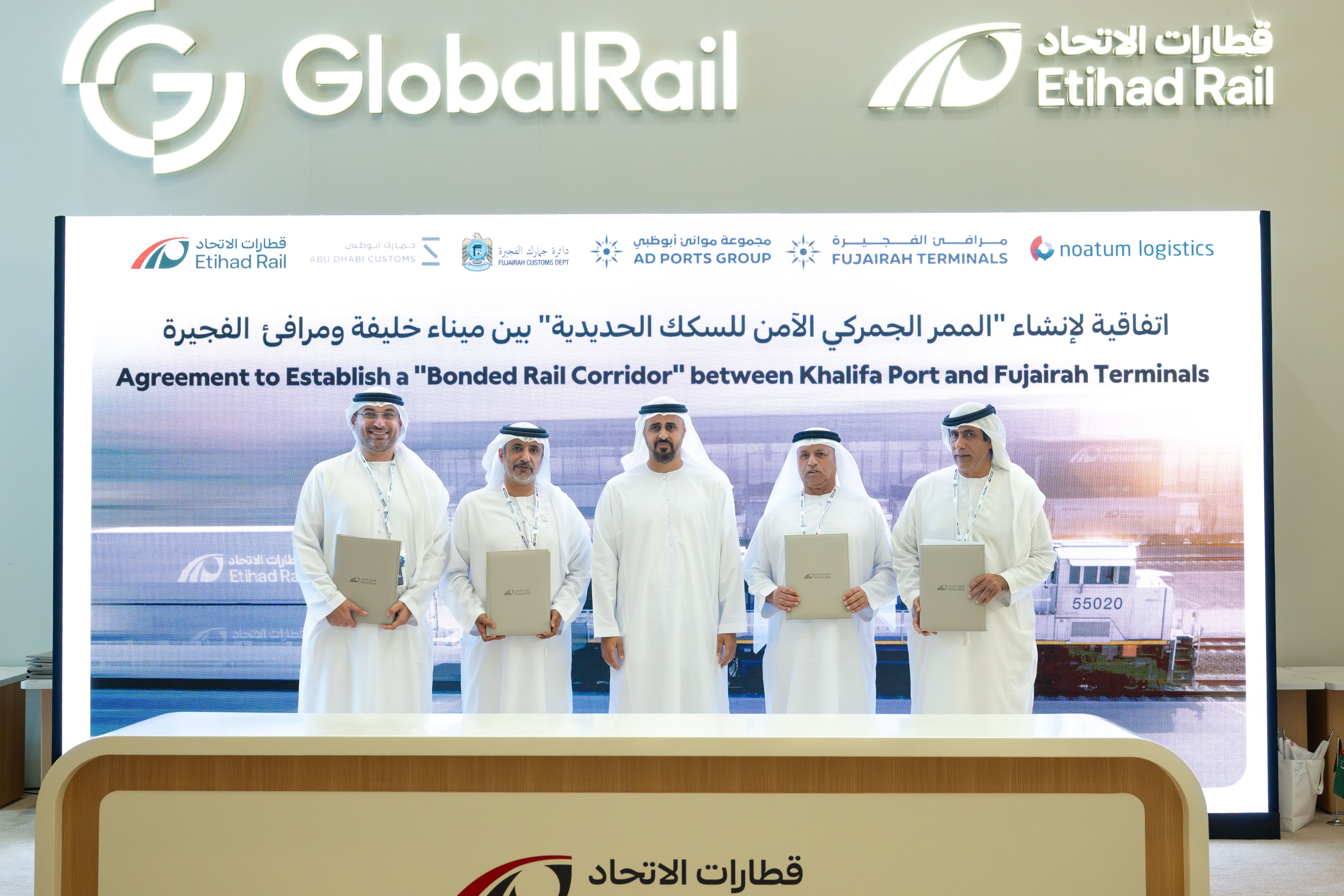 ذياب بن محمد بن زايد يشهد توقيع اتفاقية لإطلاق مشروع الممر الجمركي الآمن للسكك الحديدية بين ميناء خليفة و مرافئ الفجيرة
