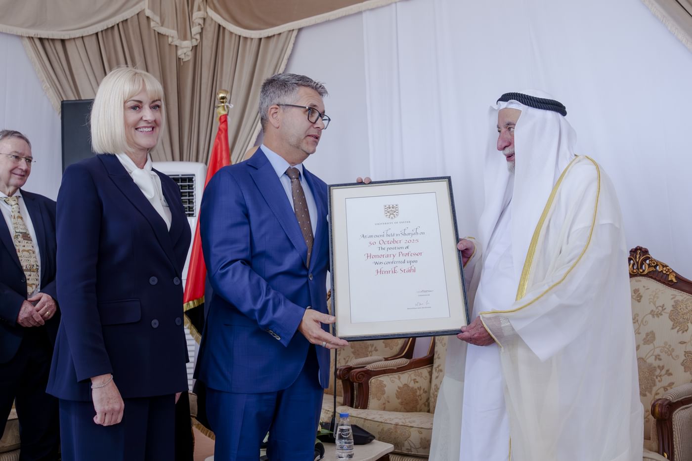 وتفضل سموه بتسليم شهادات الأستاذية الشرفية الصادرة من جامعة إكستر البريطانية، والتي تم منحها إلى الدكتور علي هلال النقبي مدير جامعة خورفكان، والدكتور ستيفن كيدمان مدير مركز الشارقة لأبحاث علوم البحار، والدكتور هنريك ستاهل عميد كلية علوم البحار والأحياء المائية في جامعة خورفكان، نظير إسهاماتهم المتميزة في إنشاء المركز وجهودهم الكبيرة في إدارته وتوفير العوامل الملائمة التي ستوفر الحماية البيئة البحرية وخدمة الإنسان والبيئة.