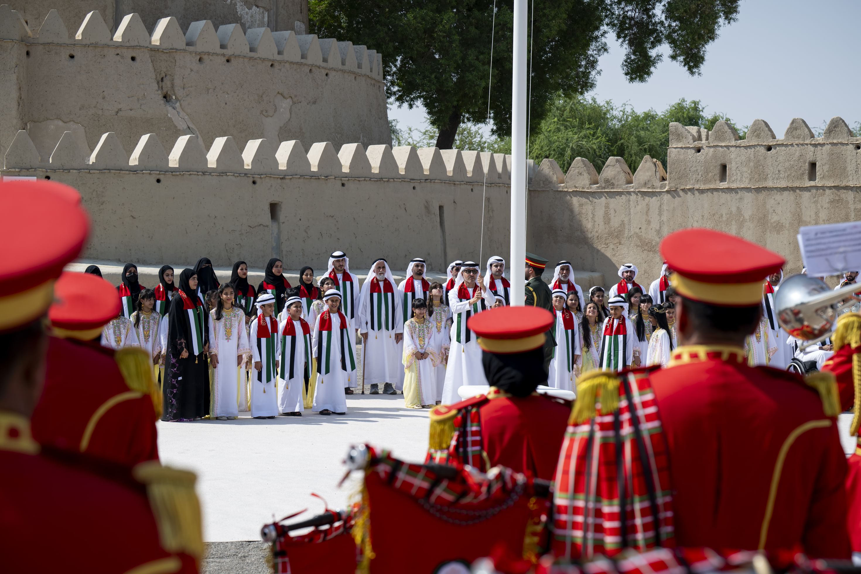 وشهدت مراسم الاحتفال الرسمي، التي حضرها عدد من أسر الشهداء وطلبة المدارس في منطقة العين، عزفَ الموسيقى العسكرية التابعة للقوات المسلحة الإماراتية للسلام الوطني، ورفعَ العلم على سارية قلعة الجاهلي.